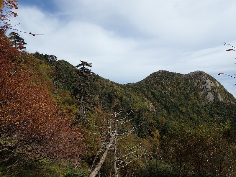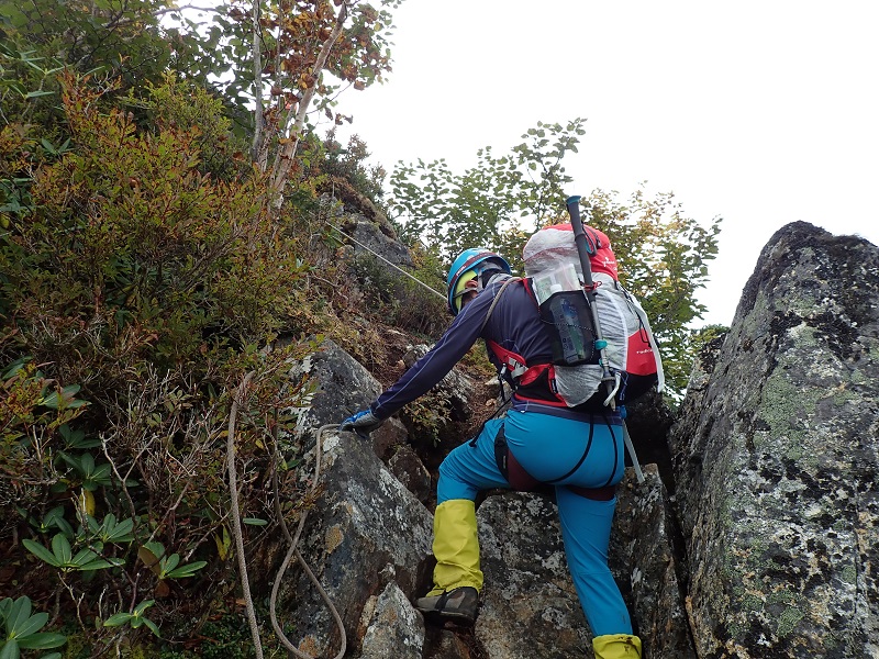 今回の担当、三上ガイドはこの仕事に就く前から長年甲斐駒ヶ岳に通い詰めている地元ガイドです。ルート上の随所でこの地にまつわる解説をたくさんお話してくれます。そんなガイディングのもと、急な登りも徐々に標高を稼いでいきます。