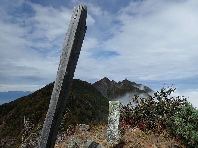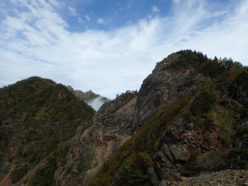 そして2日目の朝。今回も素晴らしい景色が迎えてくれました。2枚目の写真はお客様が撮られた1枚。新鮮なアングルの二本剣と空の青のコントラストに見入ってしまいました!全員無事登頂!北沢峠への下りはじめはガスが上がってきました。こういったときはうっかり道をロストしやすいものです。北沢峠への分岐を見失わないように注意しましょう。ガスの谷間から、北岳の猛々しい姿がも見えました!
