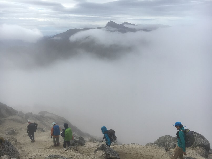 カロリー補給して、だんだん濃くなる霧の中をひたすら下ります。最後のピーク、日向山に着くころにはすっかり辺りは真っ白に。初めてだと方向感覚も失ってしまいそうです。そして、13時間を越えるロングルート、無事に歩ききっていただきました!大変おつかれさまでした!!