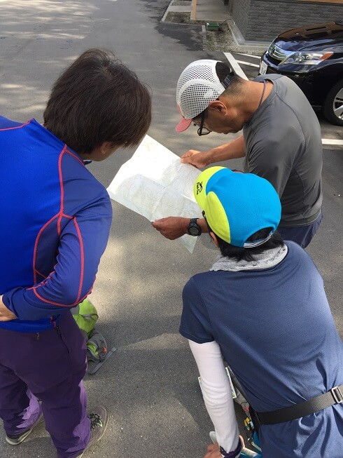 今回はお客様も2名様で少人数だったこともあり、いろんな意味でプライベート感満載の充実の山行となったようです!出発前、登山口ではさっそく三上ガイドの読図講習が始まっていました。