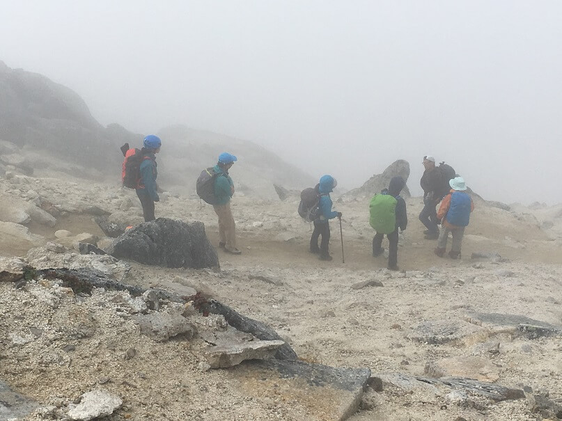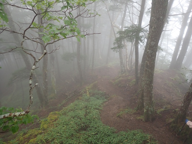 この辺りからガスが・・・こんな時は、ルートを見失わないよう慎重に。特に烏帽子からの下りは要注意です。高めの位置に付いている赤い道しるべは、七丈小屋の先代が付けてくれたもの。